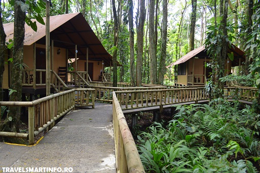 Lodgia unde am stat se numeste „Evergreen Lodge Tortuguero” si isi merita numele. Locatia este fantastica fiind una dintre cele mai ingenioase locuri de cazare in care am fost. Resortul are doar bungalow-uri care comunica intre ele printr-o retea de poteci , toate acestea fiind suspendate pe piloni. Totul este din lemn, oferind o senzatie de intimitate cu natura. Intimitatea cu padurea tropicala sporeste in timpul noptii cand tipetele maimutelor urlatoare sau ploaia torentiala nu te mai prea lasa sa dormi 🙂 Sa mai amintesc ca pe post de geamuri aveam niste plase acoperite rulouri de panza …