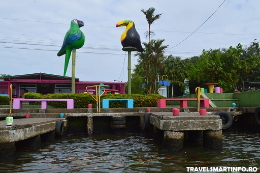 La 10 minute de mers cu barca se afla satul Tortuguero, de fapt cateva case imprastiate printre cocotieri, o scoala si o strada cu tarabe cu suveniruri si terase. Satul in sine nu impresioneaza prin nimic atunci cand pui piciorul jos din barca dar el este recunoscut datorita plajei cu nisip negru din apropiere unde broastele testoase isi depun ouale. La sosire, pe docuri te astepta un papagal si un tucan … S-ar fi putut mai multa ingenizitate 🙂