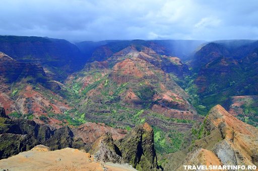 In partea de vest a insulei Kauai, se intinde pe aproximativ 16 km lungime Canionul Waimea, cunoscut si cu numele de „Marele Canion din Pacific”. Canionul are 900 m adancime si s-a format in urma cu 5 milioane de ani prin eroziunea Raului Waimea si ofera vizitatorilor o gama variata de nuante rosii, maro si verzi care sunt complementate de cascade si curcubee (din cand in cand si cu putin noroc 🙂 ). Cea mai complexa vizita a canionului o vei avea cu siguranta din elicopter, insa sunt posibile si anumite trasee pentru drumetii.