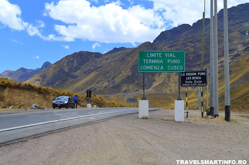 Din acest punct, de la 4.335 metri, soseaua coboara vizibil iar peisajul se schimba capatand aspectul unei vai din ce in ce mai verde, pe masura ce ne apropiem de Cusco. Am trecut si pe langa „granita” dintre cele doua regiuni: Puno si Cusco.